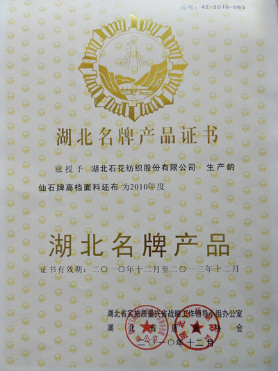 “仙石”牌布料獲湖北省工商局消費者滿意商品稱號 |