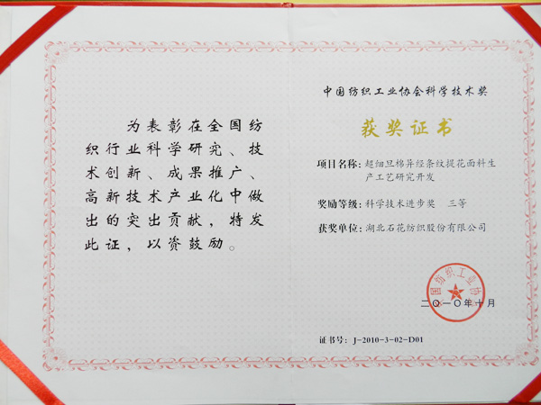 | 中國紡織工業(yè)協(xié)會科學(xué)技術(shù)獎獲獎證書 | |